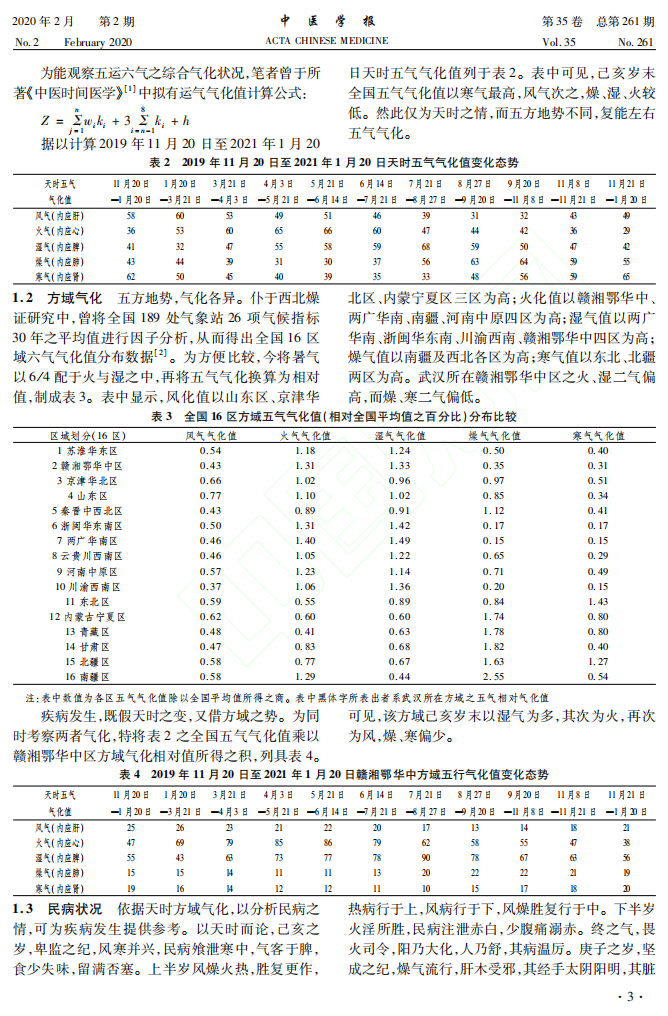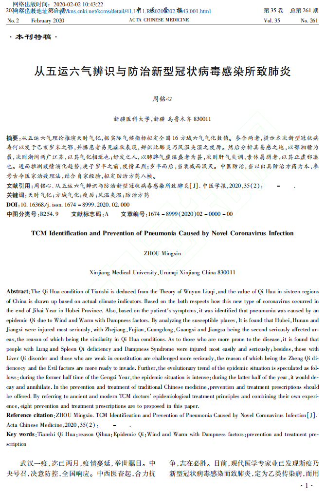 本网讯(文图/任平)当前,新型冠状病毒肺炎疫情防控形势十分严峻。为全力配合新型冠状病毒肺炎防控和诊治工作,记录和展示中医药在防治疫情方面的独特优势,更好地服务于疫情防治一线,《中医学报》特约周铭心教授撰写《从五运六气辨识与防治新型冠状病毒感染所致肺炎》一文(1月29日收稿),并于2020年2月2日网络首发。文章从五运六气理论推演天时气化,据实际气候指标拟定全国16方域六气气化数值,提示本次新型冠状病毒何以发于己亥岁末之鄂,通过分析其易感之地、好发之人,进而推测疫情演化趋势,同时参考古今医家治疫理法,拟定防治方药八帧。现将周铭心教授的《从五运六气辨识与防治新型冠状病毒感染所致肺炎》转发于此,冀为新型冠状病毒肺炎病因病机的认识及治疗提供参考。