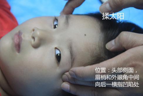操作:推揉法:食指、中指、无名指三指并拢,中指对准并吸定太阳穴,双手同时由后向前旋转推揉,以太阳穴区酸胀为度,30次/分;点振法:双侧中指同时对准太阳穴震颤,100次/分。