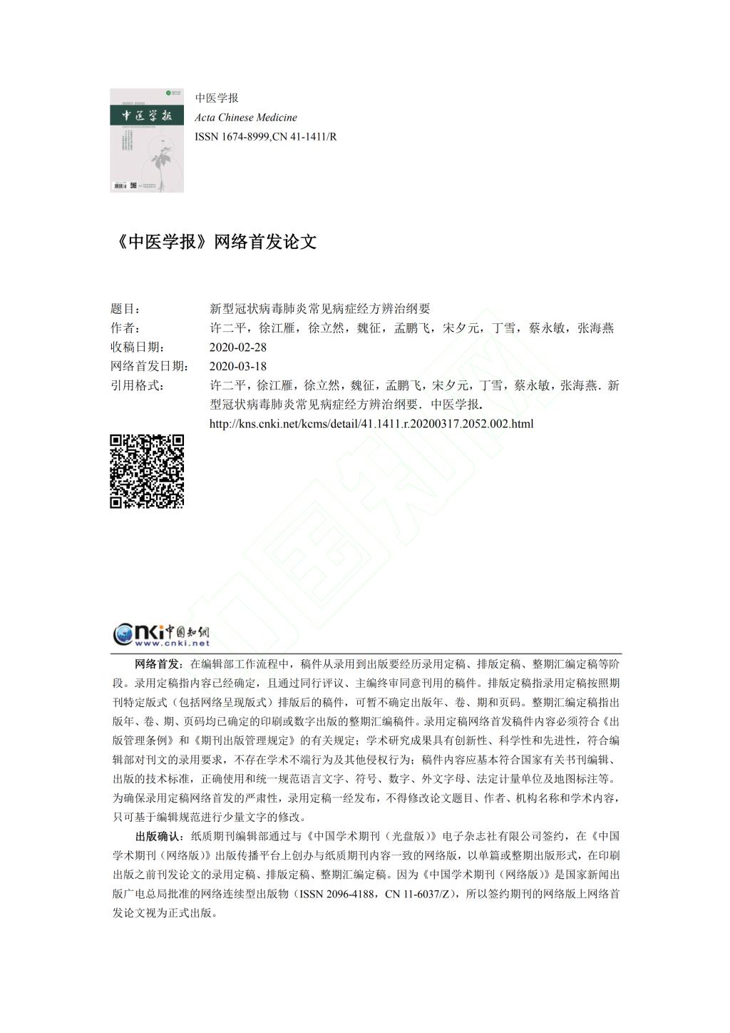本网讯(文图/任平)《伤寒杂病论》是治疗传染性疾病并杂病的专著,内容丰富,理法方药俱全,为诊治传染性疾病提出了辨证纲领和治疗方法,被奉为医学经典。为了更好地用经典指导新型冠状病毒肺炎常见病症的中医临床治疗,由我校许二平教授牵头起草了《新型冠状病毒肺炎常见病症经方辨治纲要》,针对新型冠状病毒肺炎发热、咳痰、喘息、大便秘结、神昏等常见病症,归纳整理了经方辨治规律。《中医学报》将该纲要于3月18日进行网络首发(2月28日收稿),为运用张仲景《伤寒杂病论》学术思想诊疗新型冠状病毒肺炎提供了参考。现将许二平教授的《新型冠状病毒肺炎常见病症经方辨治纲要》转发于此,供临床参考。