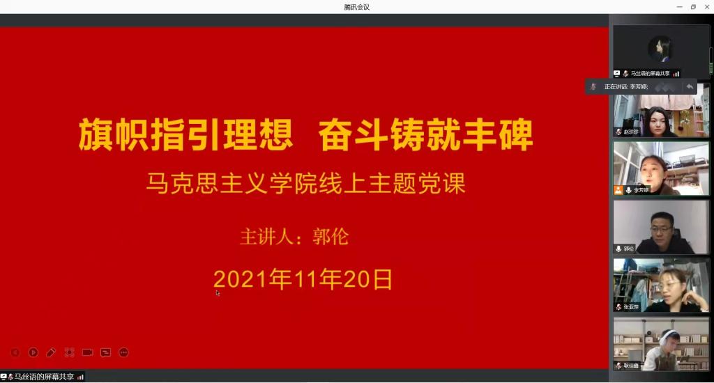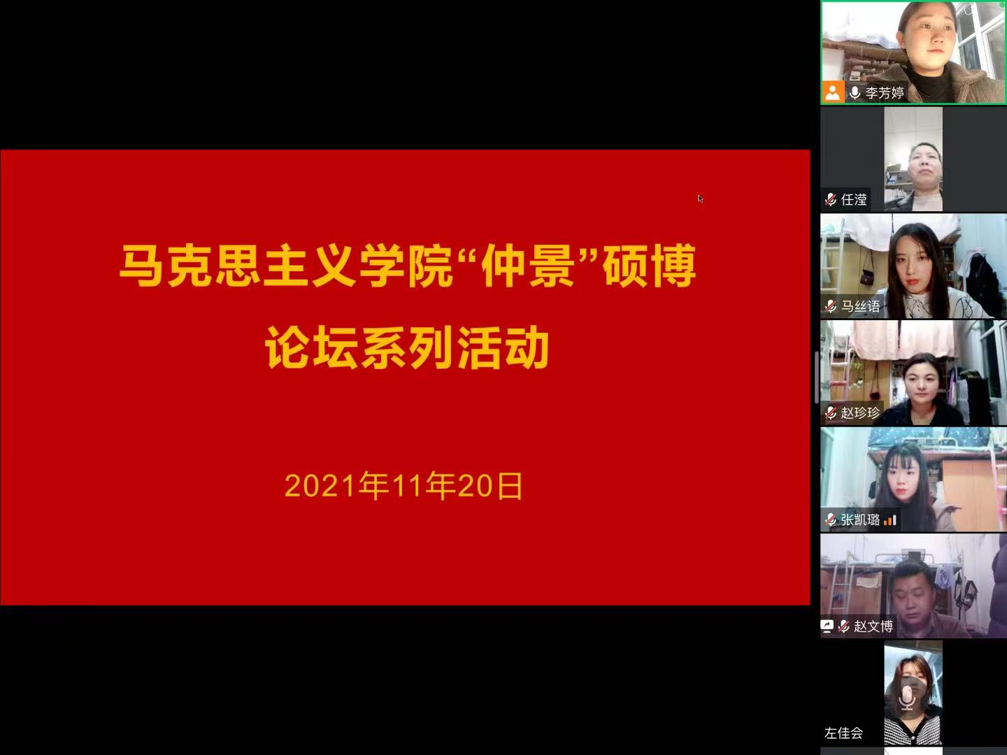 本网讯(文/秦盼盼 苏敏 图/张金霄)为落实立德树人根本任务,提升研究生学术水平,2021年11月17日和20日下午,马克思主义学院研究生主题党课暨硕博论坛系列活动于线上成功举办。本次硕博论坛邀请马克思主义学院学科与研究生办公室主任任滢,青年博士张梦露、刘岳超、陈建威,学院教师张迎雪担任评委。马克思主义学院副院长郭伦出席参加本次论坛并讲授主题党课,本次论坛由马克思主义学院研究生会主席苏敏主持。
