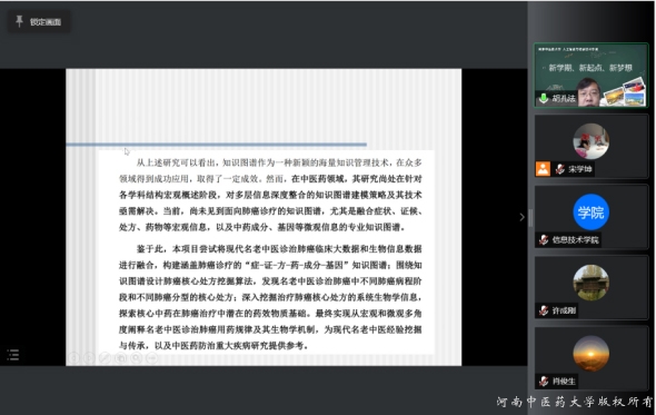 信息技术学院党委书记马赟在总结讲话中对全体教师进行鼓劲加油。她表示,科研工作要既要发挥自己专长,又要开阔视野、注重学科融合;既要树立信心、孜孜以求,做好基础工作,又要注重成果转化;既要具有科学家精神,潜心钻研,又要通过高水平成果来提升获得感、成就感和幸福感。我们要抓住新一代信息技术创新发展的机遇,牢记习近平总书记视察南阳时的讲话精神,做好医工融合,凸显中医药信息化和现代化的发展特色,为学院转型发展和学校一流中医药大学建设作出新的贡献。