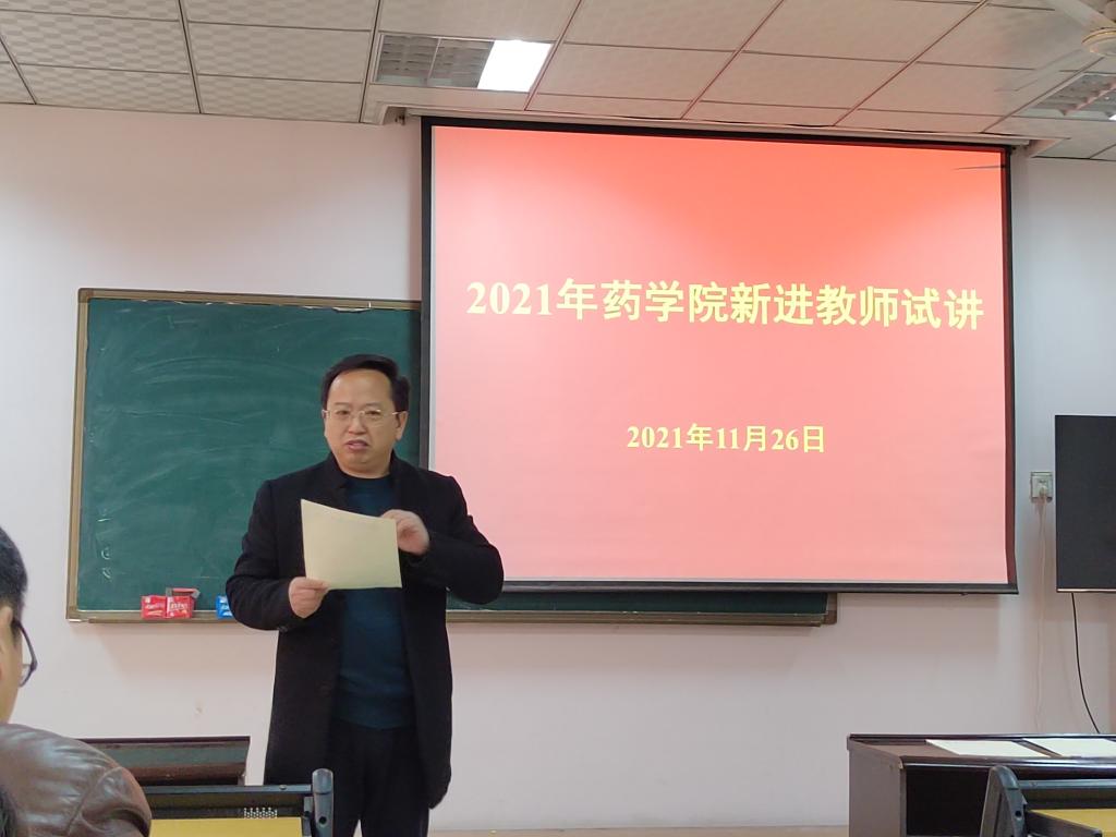 本次活动分为两个阶段,第一个阶段由教研中心组织,由教学水平和学术水平较高、教学经验丰富的教师组成试讲考核小组,考核小组对试讲教师的教学设计、讲授内容、教学方法等进行全面的考核,教研中心考核通过之后进行第二个阶段院部层面的试讲。药学院于2021年11月26日上午举行了院部层面的试讲活动。活动邀请了经验丰富的教研中心主任和优秀的中青年教师担任评委,本次试讲共有6位老师参加,活动由教学办主任朱鑫主持。