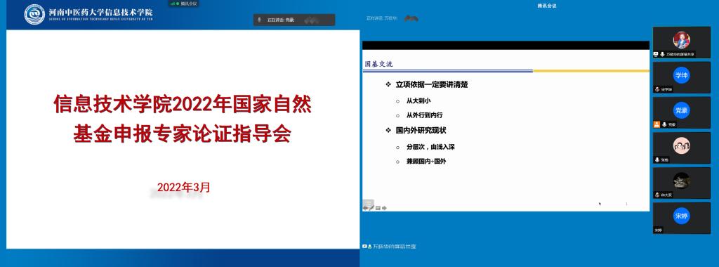 本次活动是信息技术学院针对2022年国家自然科学基金项目申报工作进行的提升和冲刺。此前,各位申请人已经在学院的支持下先后邀请华中师范大学、南京航空航天大学、郑州大学、上海师范大学等多位专家进行线上的交流和指导。开展系列线上交流和指导工作一方面有助于进一步提升我院国家自然科学基金项目申报的质量,另一方面通过向省内外专家的请教和交流,更加开阔了我院广大青年教师的科研视野,有助于提升我院广大青年教师的科研能力。