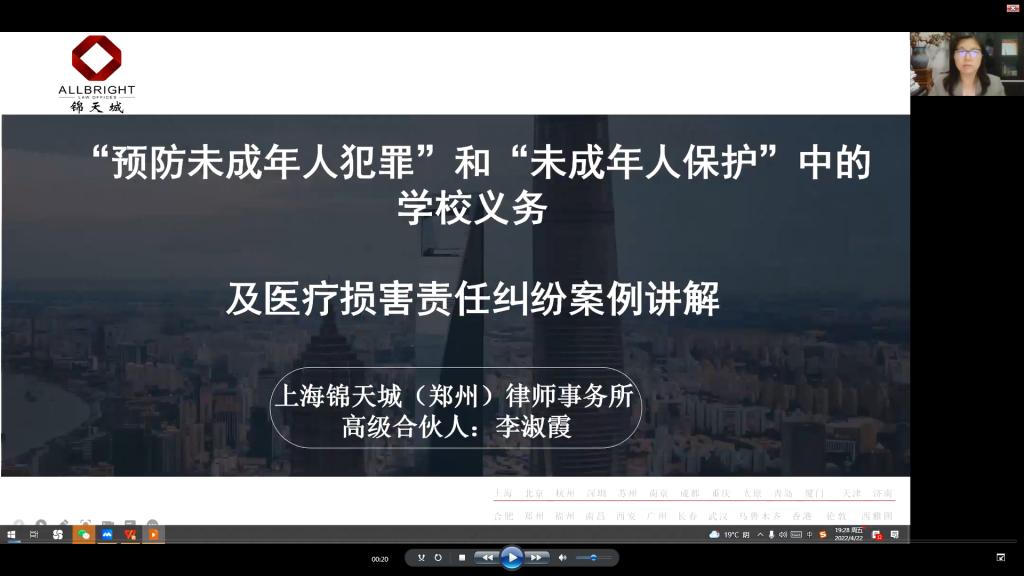 本网讯(文图/胡娜丽)2022年4月的第三周是我省首届全省教育系统法治教育宣传周。为进一步推动习近平法治思想进课堂、进教材、进头脑,使尊法学法守法用法成为我校师生的共同追求和自觉行动,儿科医学院在院党委书记任献青的统一部署下,2022年4月22日下午,儿科医学院教职工党总支特邀上海锦天城(郑州)律师事务所高级合伙人高级律师李淑霞通过腾讯会议为儿科医学院教职工开展线上法制知识宣讲。儿科医学院党委副书记杨小红、学院教职工党总支书记黄岩杰、儿科医学院教职工党员参加会议。会议由学院教职工总支副书记张蕾主持。