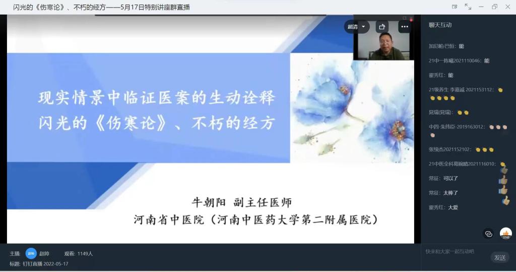本网讯(文图/常征)仲景经方传后世,中医精粹显光芒。为了弘扬中医药文化,增强同学们文化自信和专业自信,帮助同学们更好地学习、领悟、掌握中医经典,把中医药文化精髓传承好、发展好、利用好,第二临床医学院于2022年5月17日晚在线上举办了“现实情景中临证医案的生动诠释—闪光的《伤寒论》、不朽的经方”学术讲座。本次学术讲座邀请河南省中医药传承与创新人才工程(仲景工程)中医药拔尖人才、河南省“仲景国医传人”精英班学员、河南省中医院21世纪门诊部主任牛朝阳主讲,我校各专业学生踊跃参与,2000余名学生同时在线收听收看。