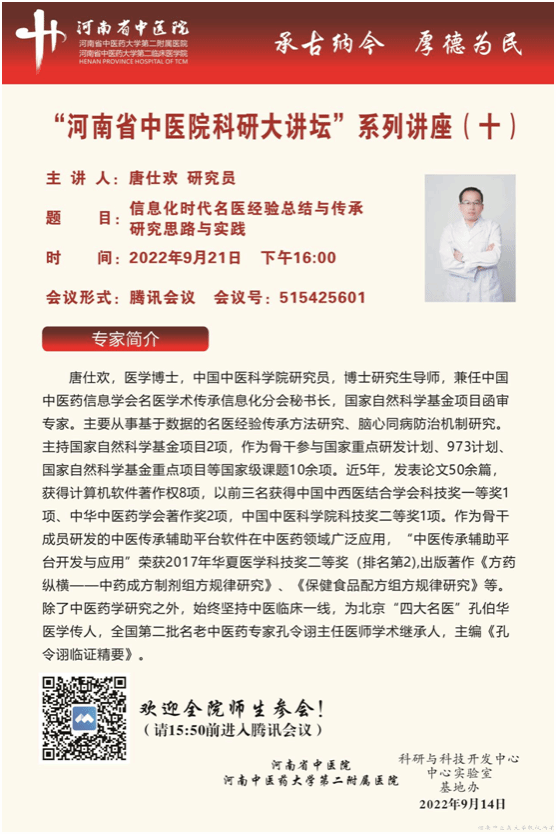 本网讯(文图/韩亮)为提高二附院科研实力,助力2023年度国自然申报工作,二附院科研与科技开发中心、基地建设办公室、中心实验室于2022年9月21日下午联合举办“河南省中医院科研大讲坛”系列讲座第十期。本期讲座邀请中国中医科学院研究员、中国中医药信息学会名医学术传承信息化分会秘书长唐仕欢研究员作题为“信息化时代名医经验总结与传承研究思路与实践”的学术讲座。