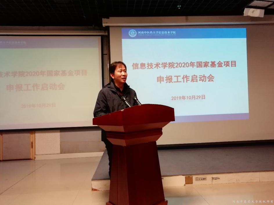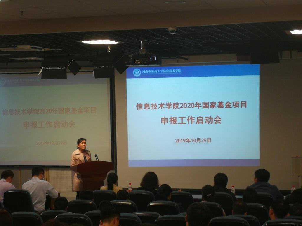本网讯(文图/许玉龙 宋学坤)2019年10月29日下午,信息技术学院在A634多媒体教室举行2020年国家自然科学基金项目申报工作启动暨经验报告会。校科技处副处长余海滨、信息技术学院党政领导班子、全体教职工和各科研工作室优秀学生参加了会议。会议由科研办主任宋学坤主持。