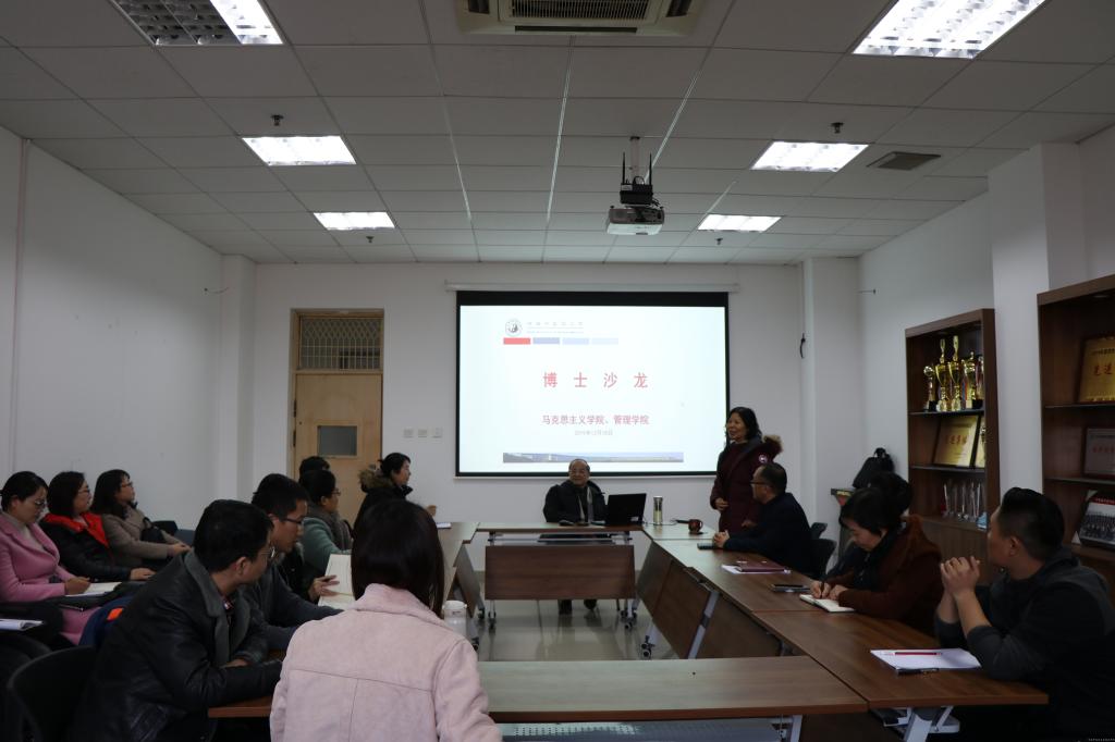 本网讯(文/高婷 图/黄璐)为搭建学术交流平台、增进学术交流、提升教职工科研能力、营造浓厚的学术氛围,2019年12月18日下午马克思主义学院、管理学院在教学楼A542管理学院会议室联合举办2019年度“博士沙龙”。特邀河南大学二级教授、博士生导师张兴茂担任主讲,马克思主义学院、管理学院的班子成员、博士、学术骨干教师、研究生参加此次活动。活动由管理学院院长张丽青教授主持。
